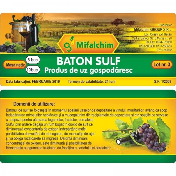 BATOANELE DE SULF cu lamela pe suport de carton, reprezinta o solutie eficienta pentru mentinerea calitatii vinului prin eliminarea mirosurilor neplacute si a depunerilor de mucegai din recipientele de depozitare si din spatiile ce servesc ca depozit pentru pastrarea legumelor, fructelor, cerealelor. Lamela de sulf este plasata pe un suport de carton, se suspenda de o sarma, iar dupa aprindere elibereaza vapori de sulf. Vaporii eliberati actioneaza in mod eficient prin neutralizarea mirosurilor nedorite si prevenirea dezvoltarii mucegaiului in crame, pivnite si depozite de vinuri. BATOANELE DE SULF devin astfel un aliat esential in mentinerea caracteristicilor organoleptice ale vinului si conservelor, contribuind la mentinerea prospetimii si calitatii produselor depozitate.